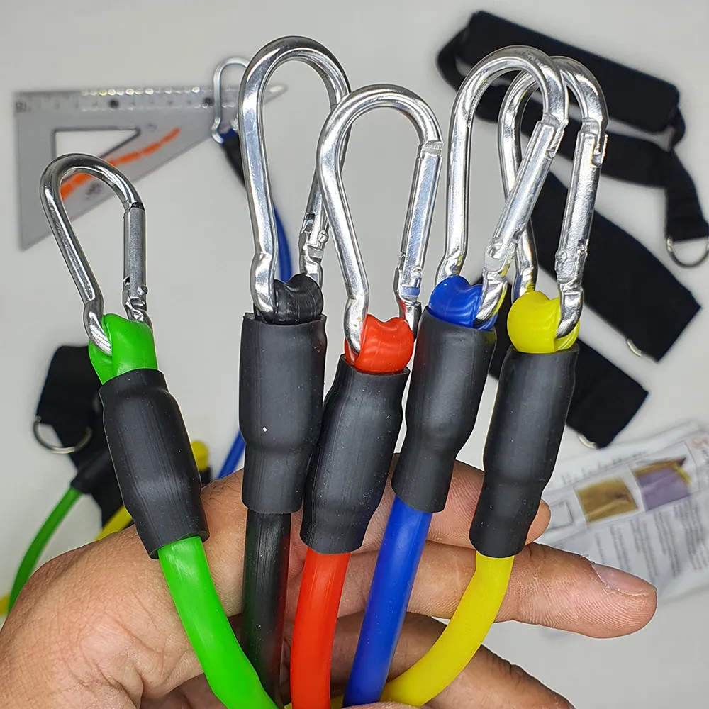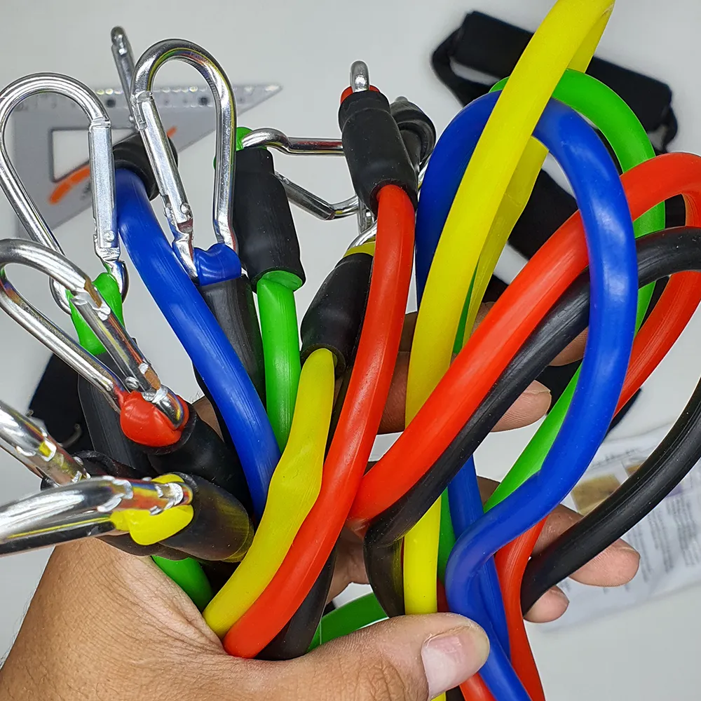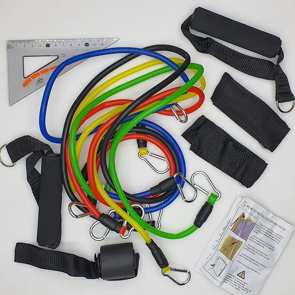 تتكوّن المجموعة من 11 قطعة تشمل: 5 أربطة أنبوبية، مقبضين مبطنين، مرساة باب، حزامين للكاحل، وحقيبة حمل عملية.